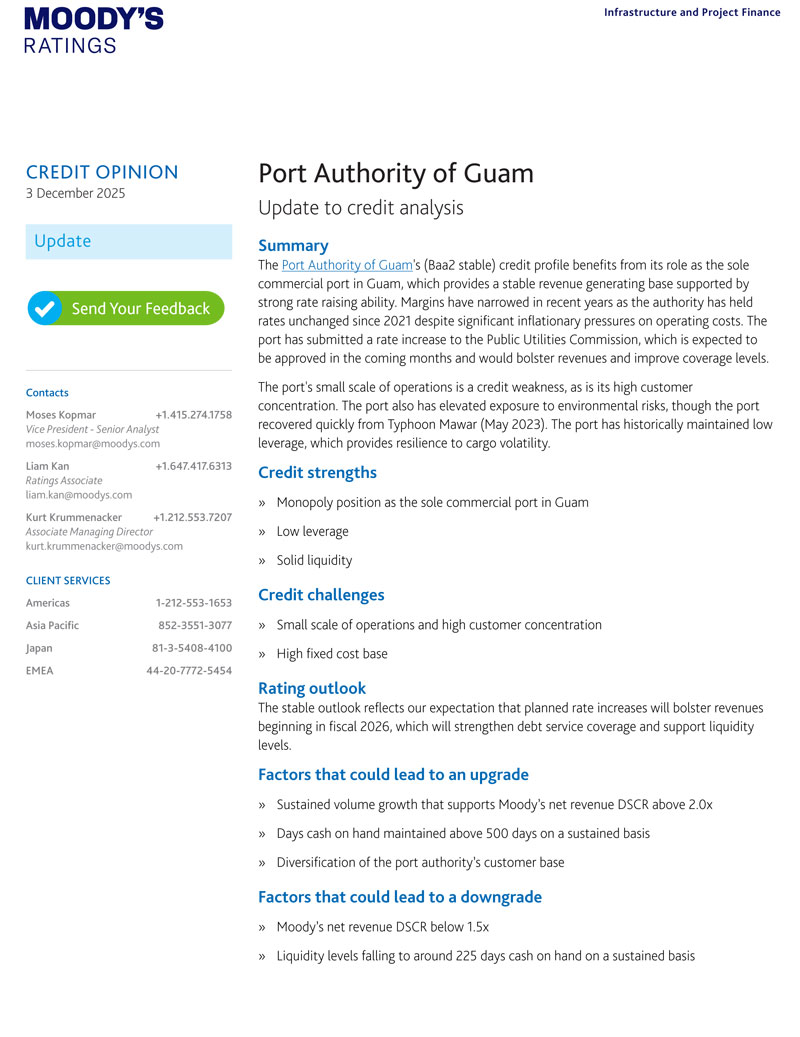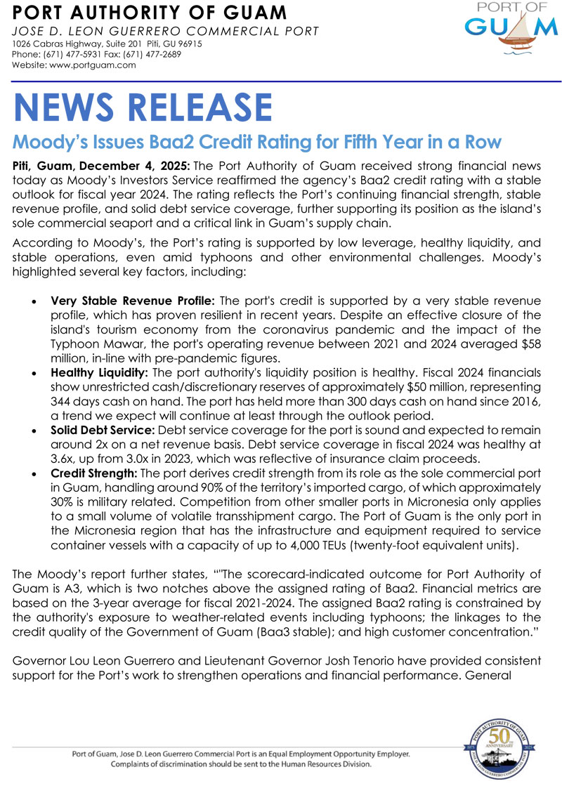 Moody’s Issues Baa2 Credit Rating for Fifth Year in a Row